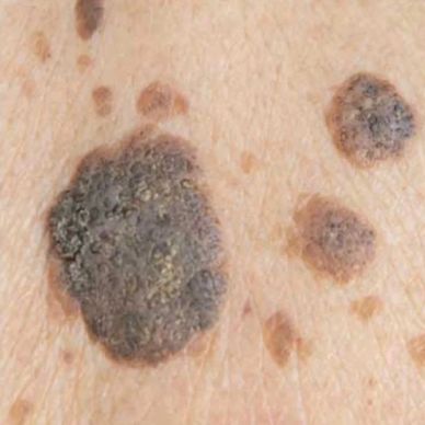 Seborrheic Keratosis are very common non-cancerous skin growth. They look waxy/scaly and are slightly raised. They come in all different shapes and sizes and may stand alone or be present in clusters. They are a range of different colours; skin-coloured, yellow, brown (all different shades),black and white.