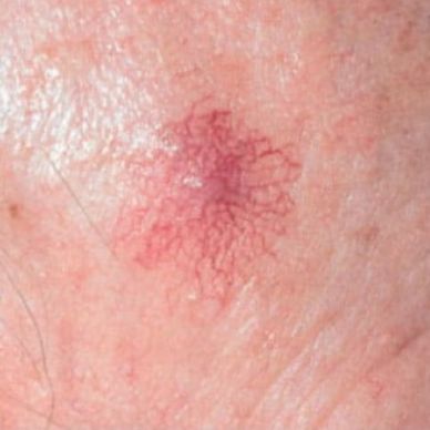 A Spider Naevus also known as a ’Spider Angioma’ or ‘Nevus Araneus’ is a small red mark on the skin that looks like a spider due to its central red dot with tiny blood vessels travelling outwards resembling spider legs. A Spider Naevus is a cluster of dilated blood vessels near the skins surface often appearing on the face, neck, and upper chest area.